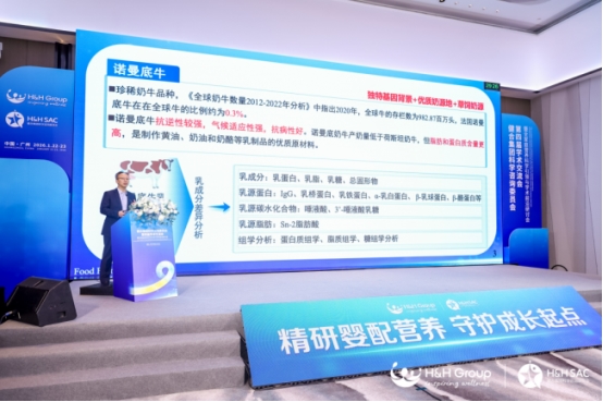 东北农业大学副校长、食品科学系教授姜毓君分享了“原料营养特性及婴幼儿配方乳粉品质提升关键技术研究进展”,他提到,优质奶源是品质基石,其中诺曼底牛奶源依托独特的品种基因背景,具备非常好的营养特性,是制备高品质婴幼儿配方乳粉的理想原料。