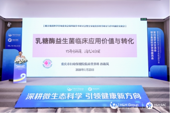 重庆市妇幼保健院临床营养科主任孙海岚分享了“乳糖酶益生菌临床应用价值与转化”,结合了重庆市妇幼保健院与合生元共同推出的“乳糖酶益生菌调制乳粉”的临床应用数据,展示了产学研合作的价值。